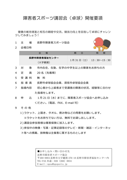 | 申し込み | 1月21日(水)までに長野市障害者スポーツ協会へお申し込みください。 氏名、年代(学年)、電話番号、障害名をお知らせください。 TEL・FAX共通:026-266-8834/E-Mail:npsa@npsports.jp |